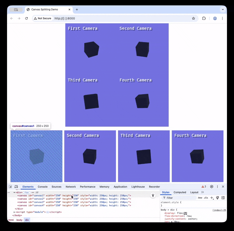 After finding out that it’s not currently possible to render to multiple canvases in bevy “fixing-multicanvas-support-in-bevy”. I created bevy_split_canvas it takes screenshots of the main canvas and splits it via the cameras.